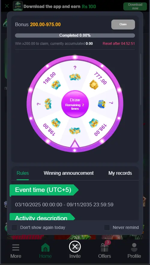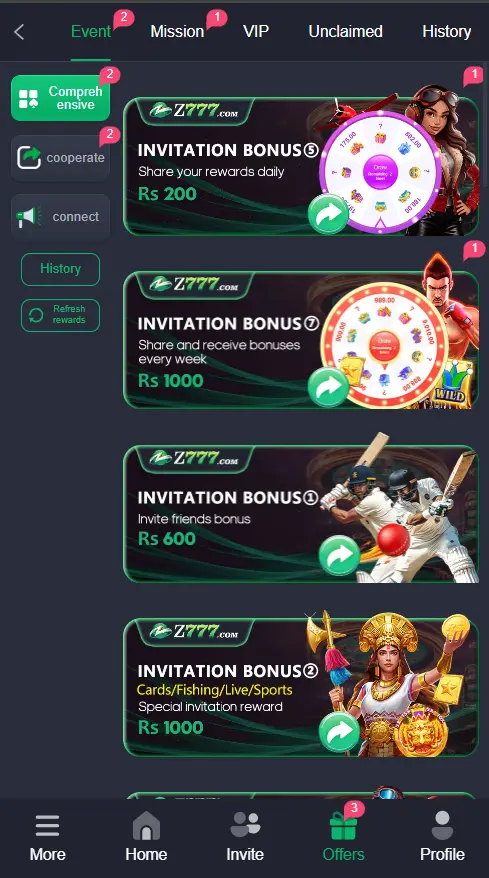 There is a fixed cash bonus for inviting new players. Rs. 600 is paid per successful invite. The referred user registers and meets the app’s activation conditions, such as a deposit. This one-time referral reward can be added. Thus, earnings increase by inviting many active players.
